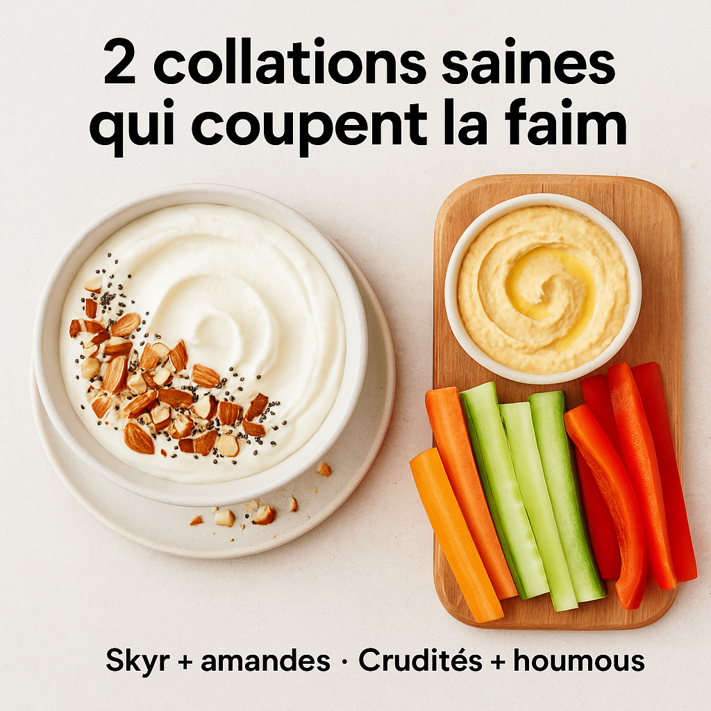 Il est 16 h. Appétit en embuscade, biscuits qui te font de l’œil. Tu connais la suite : deux bouchées, glycémie en montagnes russes, grignotage qui s’installe. Bonne nouvelle : tu peux casser ce cycle avec deux collations simples, rassasiantes, prêtes en une minute. L’idée n’est pas de “tenir” en serrant les dents, mais de nourrir intelligemment ta satiété avec des protéines, des fibres et des lipides sains. Résultat : énergie stable, cerveau focus, soirée plus sereine.